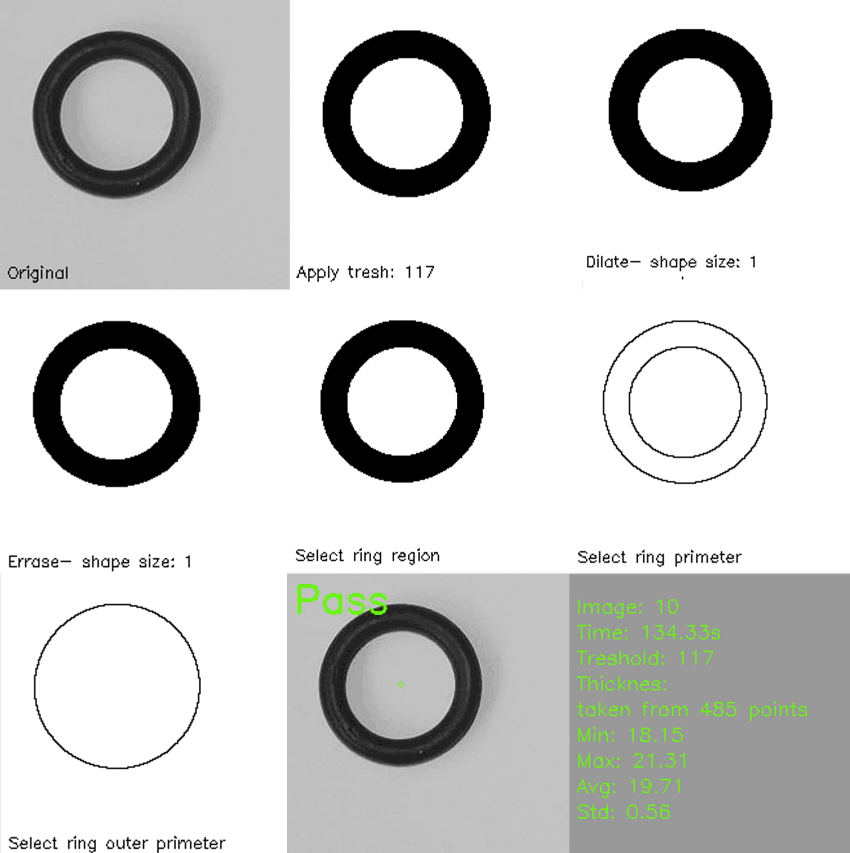 A Computer Vision Application for O-Ring Analysis inspects and classifies O-rings based on their condition using image processing techniques. The process begins with thresholding, which converts the image to a binary format to separate the O-ring from the background. To enhance the shape and remove noise, dilation and erosion are applied, ensuring a clearer representation of the object. The system then extracts regions of interest, isolating the O-ring for further analysis. Perimeter detection is used to examine the contour, identifying irregularities, breaks, or distortions. Statistical analysis follows, measuring key properties such as circularity, thickness variation, and surface defects. Based on these extracted features, the application classifies the O-ring into categories such as good, damaged, or ripped, using predefined thresholds. This automated approach improves quality control in manufacturing by providing fast, accurate, and consistent defect detection.