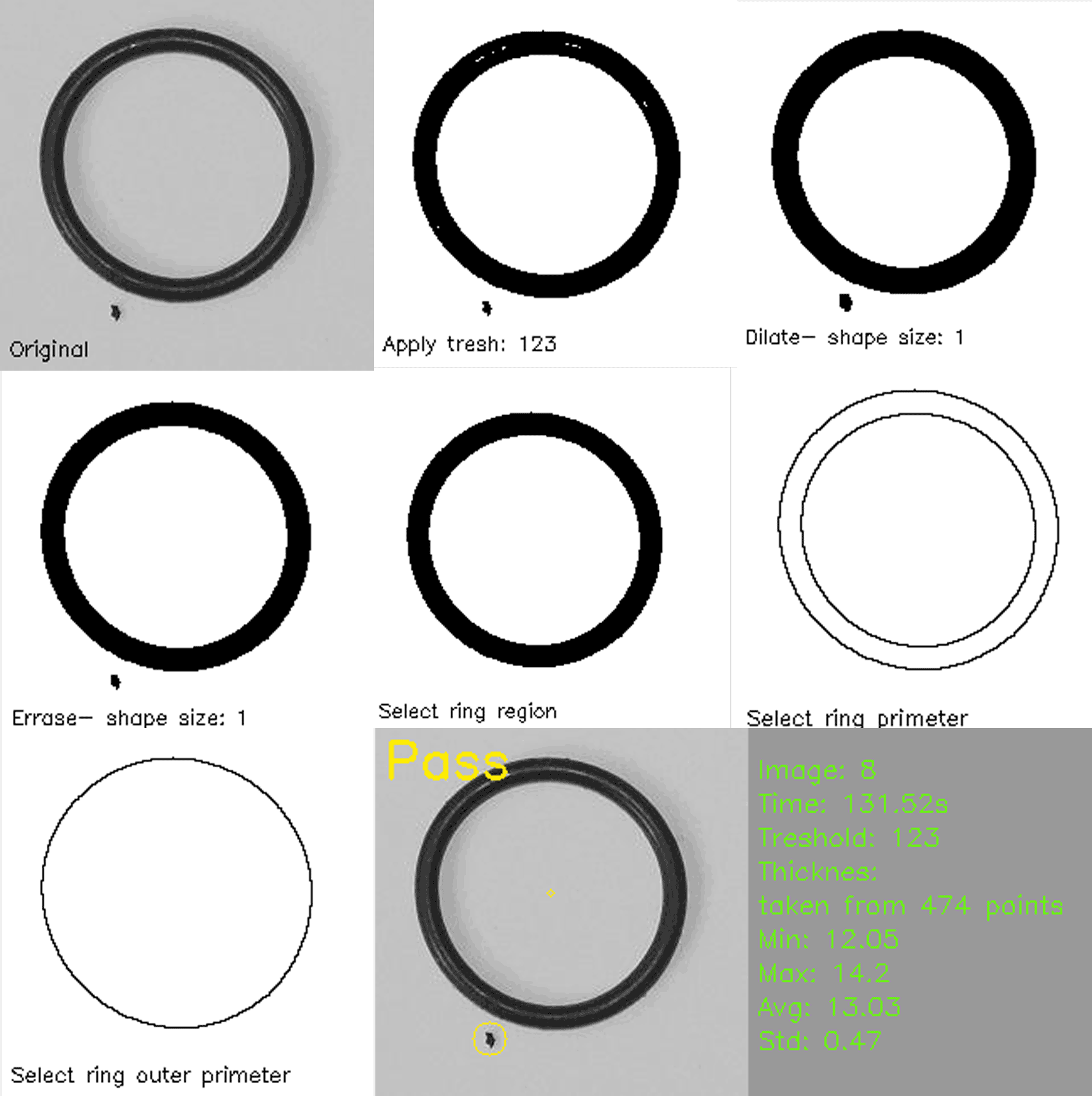 A Computer Vision Application for O-Ring Analysis inspects and classifies O-rings based on their condition using image processing techniques. The process begins with thresholding, which converts the image to a binary format to separate the O-ring from the background. To enhance the shape and remove noise, dilation and erosion are applied, ensuring a clearer representation of the object. The system then extracts regions of interest, isolating the O-ring for further analysis. Perimeter detection is used to examine the contour, identifying irregularities, breaks, or distortions. Statistical analysis follows, measuring key properties such as circularity, thickness variation, and surface defects. Based on these extracted features, the application classifies the O-ring into categories such as good, damaged, or ripped, using predefined thresholds. This automated approach improves quality control in manufacturing by providing fast, accurate, and consistent defect detection.